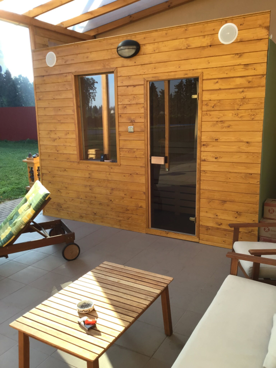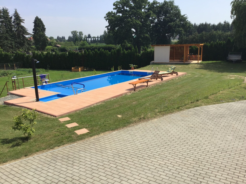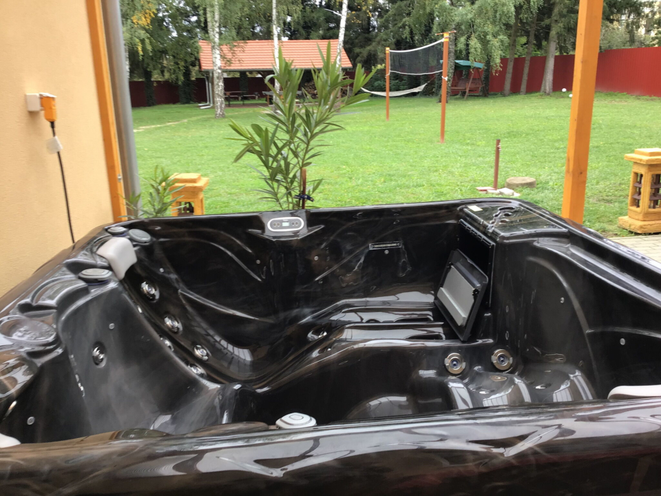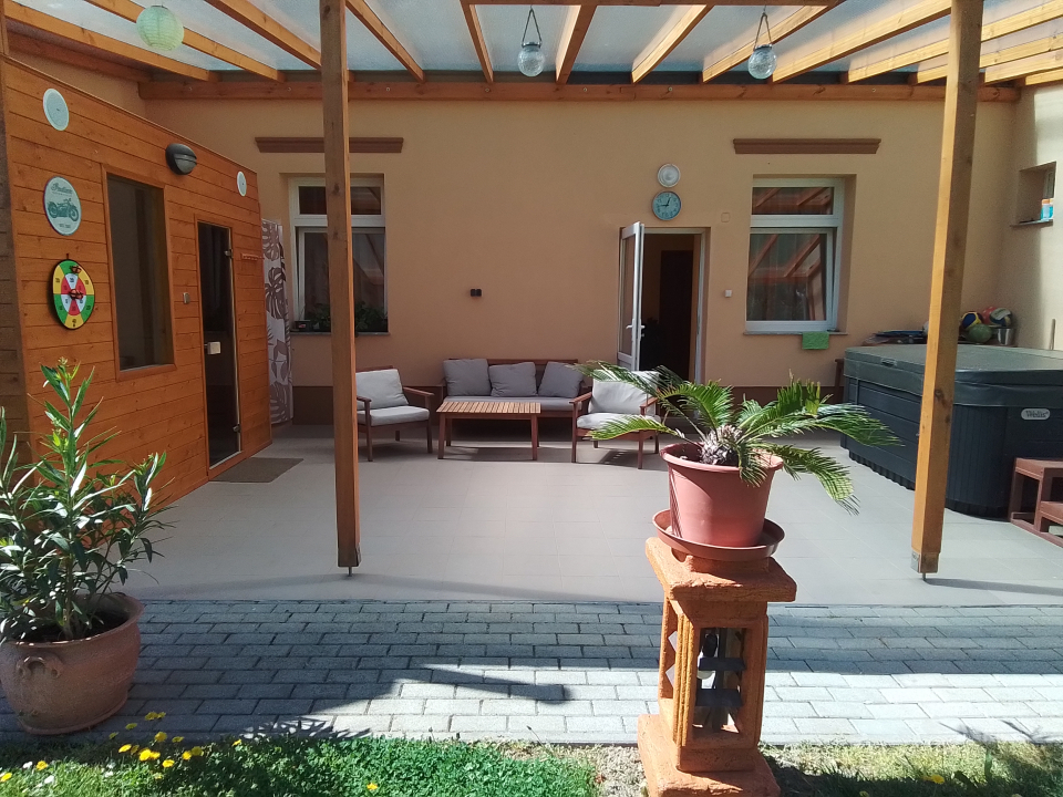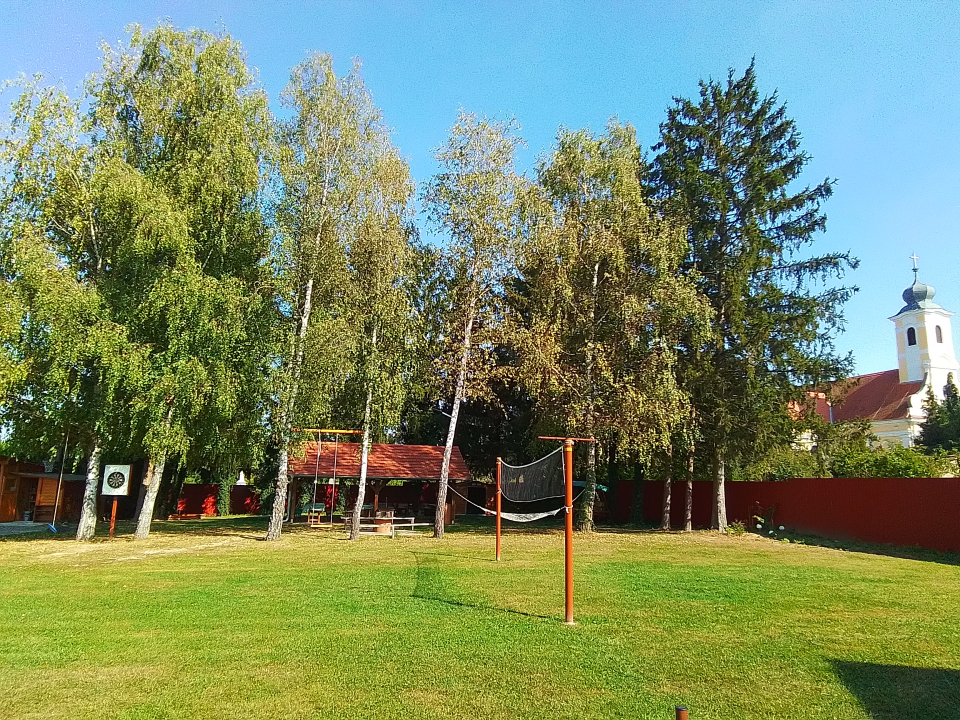 Két nagy terasz, az első a konyhából nyílik, a hátsó a wellness terasz, ahol finn szauna és ötszemélyes jakuzzi található. A kertben medence, röplabda, tollas pálya, darts, csocsó, kosárlabda, foci, ping-pong asztal, homokozó található. Az udvaron minden adott a sütés-főzéshez (bogrács, szalonna sütő, nyárs és faszenes grill).