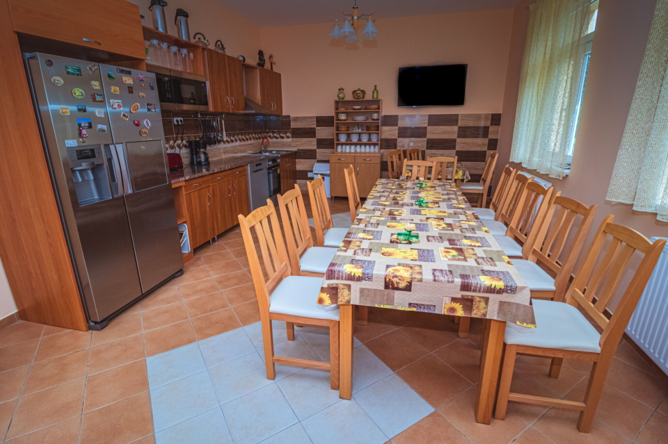 Vendégházunk hétszobás, fürdőszobákkal+kettő stúdió apartman, összesen 28-29 fő elszállásolása lehetséges.