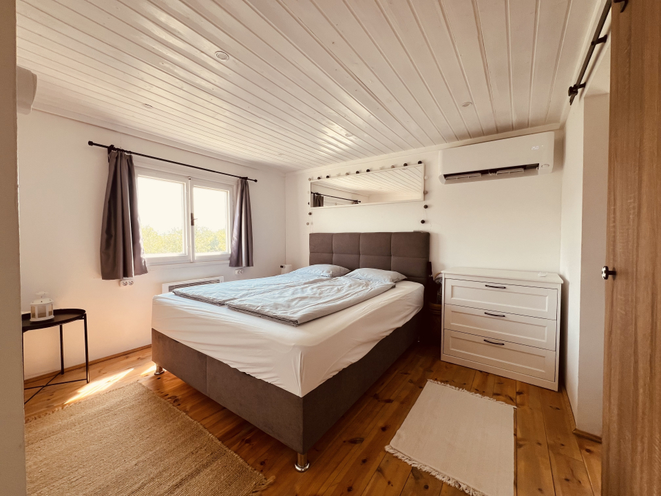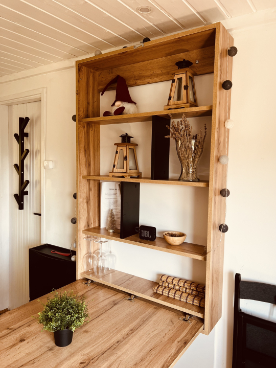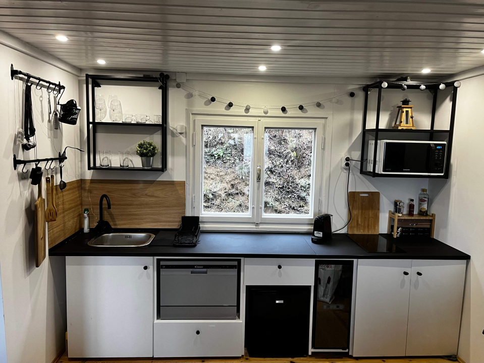 Teljeskörűen felújított 30 nm-es faház, melyben 2+2 főt tudunk fogadni. A ház amerikai konyhás nappaliból (teljes értékű 2 fős kanapéággyal) és egy franciaágyas hálószobából áll. A zuhanykabinos fürdőszoba a hálóból nyílik. Mindkét szoba teljes panorámás a Visegrádi várra es a Dunára.