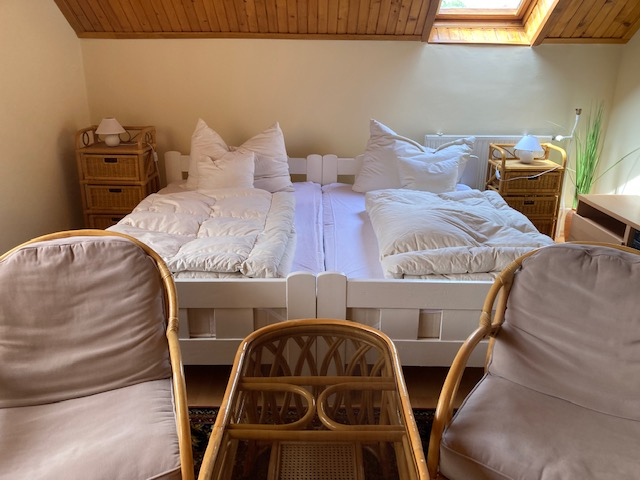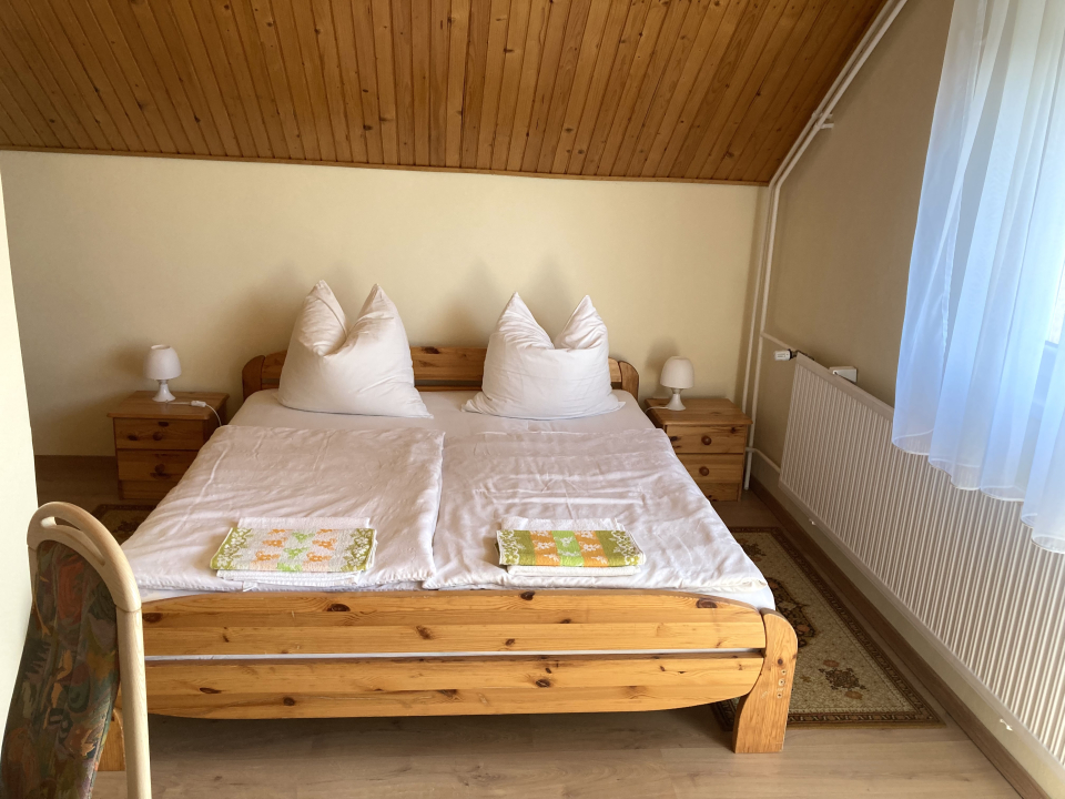 Szálláshelyünk a családi ház emeletén külön lépcsőházból közelíthető meg, és egy önálló apartmanból és egy független kétágyas szobából áll.