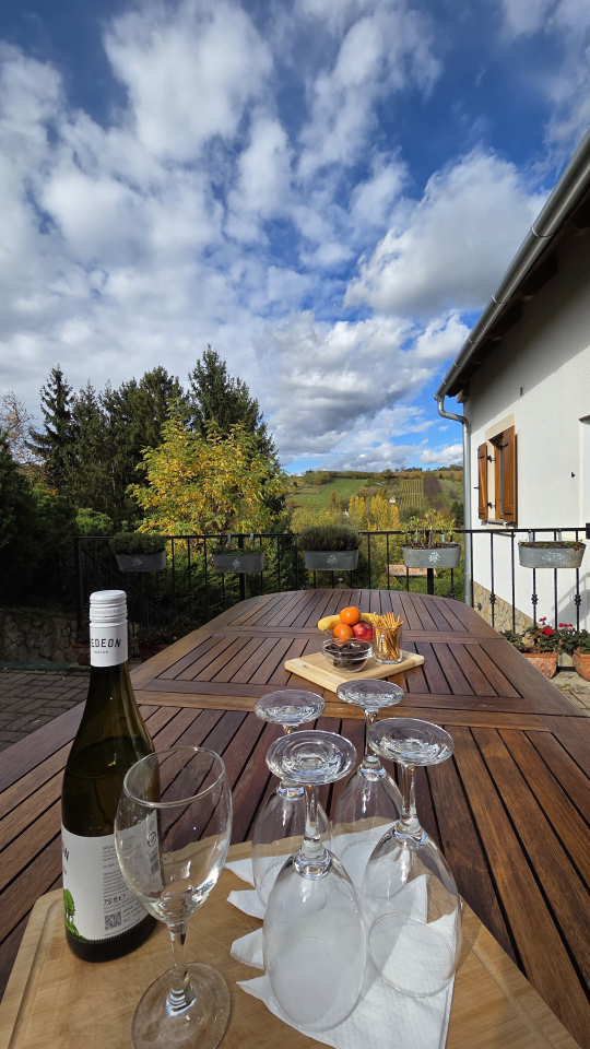 A társalgóból a teraszra lépve a szemet gyönyörködtető szőlőhegyek, az épített kerti sütő és a boros pince vastag tölgyfa ajtaja ölelnek körül, remek hangulatot adva egy meghitt esti beszélgetéshez egy pohár kellemes zalai bor társaságában.