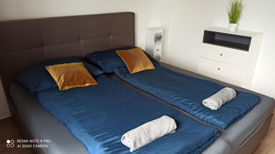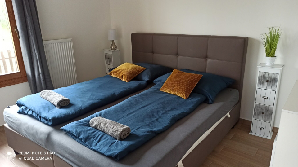 A kényelmes alvást mindkét hálószobában két dupla vagy két-két különálló ágy, a nappaliban pedig két darab kétszemélyre kinyitható kanapé biztosítja.